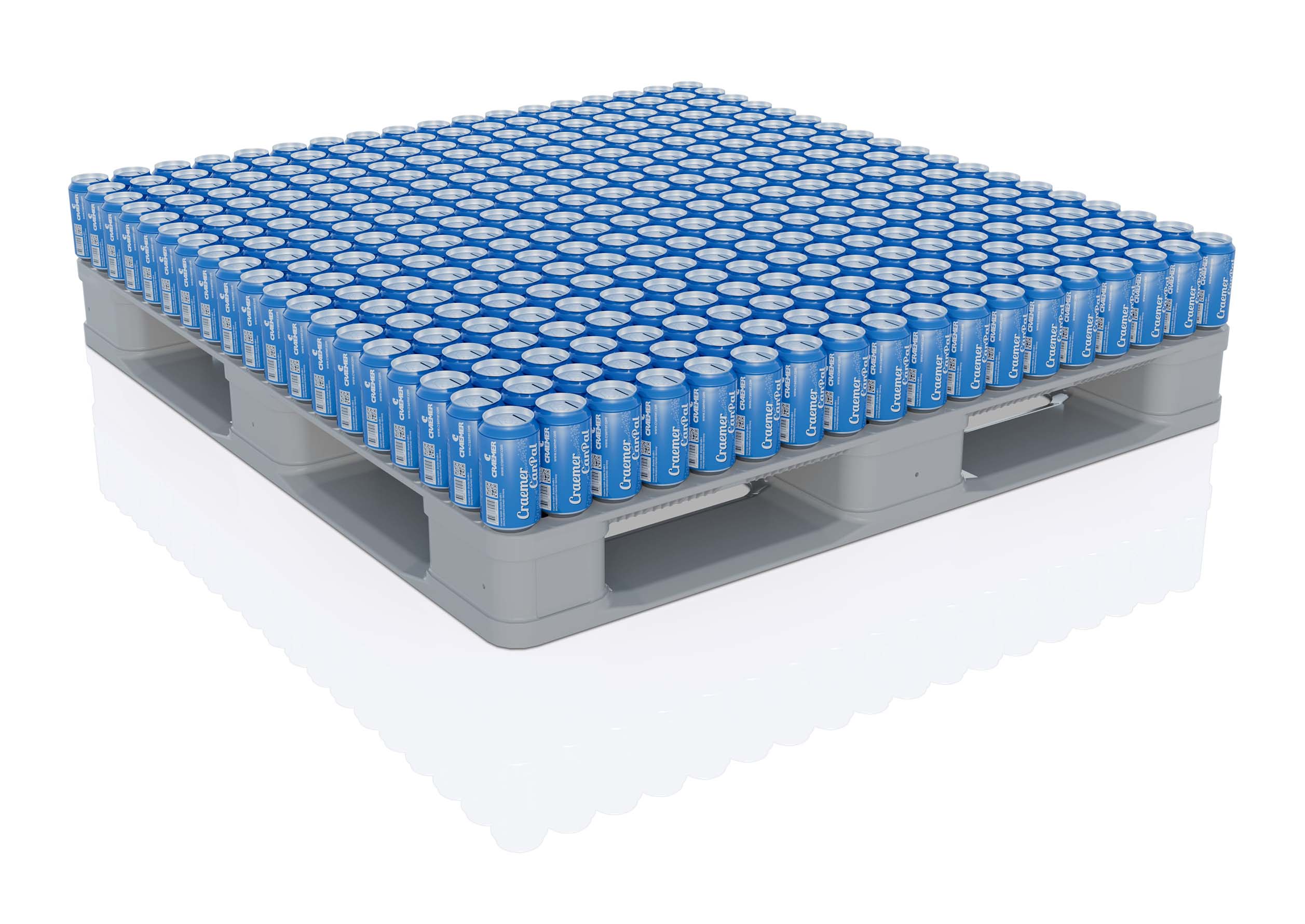 Der Grundkörper der Craemer CanPal ist auf 1250 x 1180 x 133 mm Außenmaß (Länge x Breite x Höhe) ausgelegt – mit optionalen Abstandshaltern kommt er auf 1265 x 1180 mm. Für noch mehr Schutz und Stabilität bei der Ladungssicherung, besonders bei Nutzung von Umreifungsbändern, hat Craemer die untere Kante des Oberdecks über den Einfahröffnungen gezielt durch Verrippung verstärkt. Für Robustheit steht auch der Werkstoff Polypropylen (PP) der Palette: Er ist langlebig und widerstandsfähig, sorgt für ein geringes Eigengewicht von rund 22,5 kg und ist zu hundert Prozent recyclebar. Die Traglast der neuen Craemer Dosenpalette beträgt statisch bis zu 10000 kg und dynamisch bis zu 1250 kg.