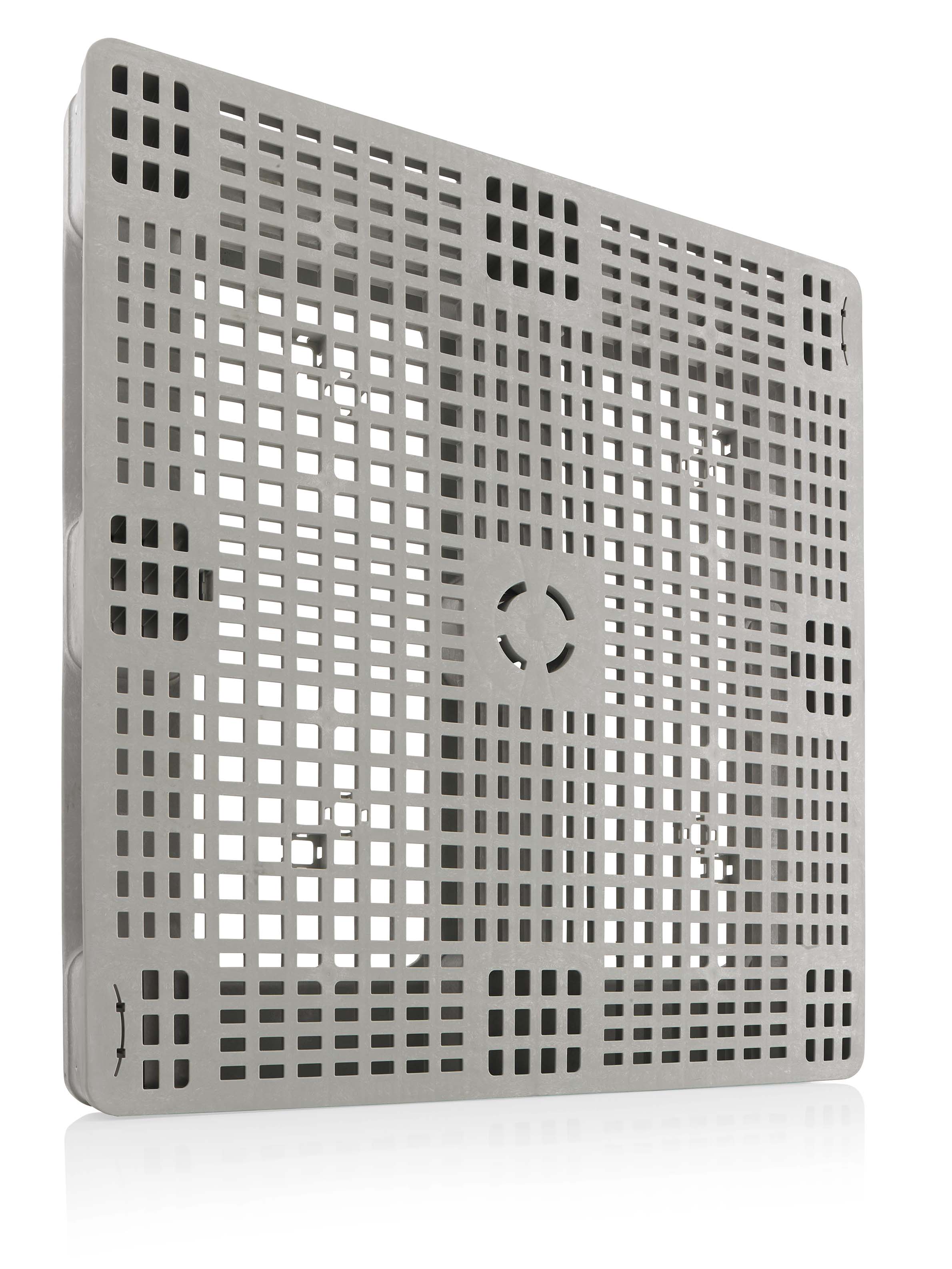 Optionale Abstandshalter an der unteren Kante im Bereich der äußeren Blöcke der Längsseiten verhindern den Kontakt zwischen benachbarten Paletten, wenn deren aufgestapelte Produkte durch überstehende Aufsatzrahmen oder Zwischenlagen zusammengehalten werden. Zur Erhöhung der Rutschsicherheit von Auflast oder auf der Gabel lassen sich Ober- und Unterdeck der CanPal nachträglich mit je vier Palgrip®-Antirutschclips ausstatten. Ebenfalls optional ist die Nachrüstung mit Transpondern: Dafür sind im Oberdeck – über den äußeren, rechten Blöcken der Längsseiten – zwei diagonal gegenüberliegende Aussparungen vorgesehen, die Smartrac Dogbone RFID-Inlays aufnehmen können. Darüber hinaus bieten die Außenblöcke der Längsseiten Platz für Heißprägungen von Schriftzügen oder Logos. Die CanPal German Pallet in der Standardfarbe Hellgrau (weitere Farben auf Anfrage) überzeugt zudem durch eine hohe Temperaturbeständigkeit von –30 °C bis +40 °C, kurzzeitig sogar bis +90 °C.
